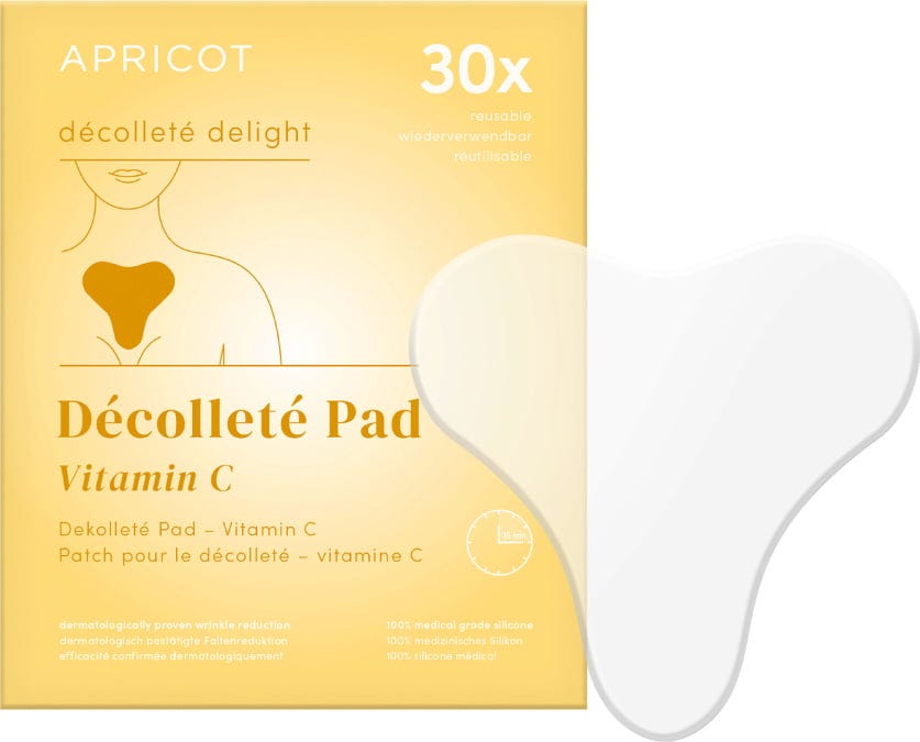 The Vitamin C Décolleté Pad by APRICOT provides intensive care for hyperpigmented or sun-damaged skin in the décolleté area. The pad is made from medical-grade silicone and is enriched with antioxidant-rich vitamin C, which helps to smooth out lines and wrinkles. It can be reused up to 30 times.