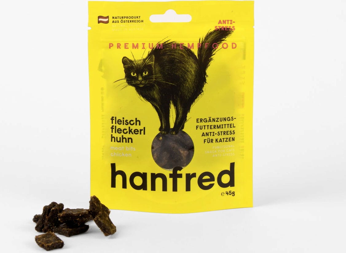 If your cat is sensitive to changes or stressful situations, this snack could be a good choice. Hanfred Meat Bites are made with 95% meat and 5% hemp powder – completely free from grain and artificial additives.