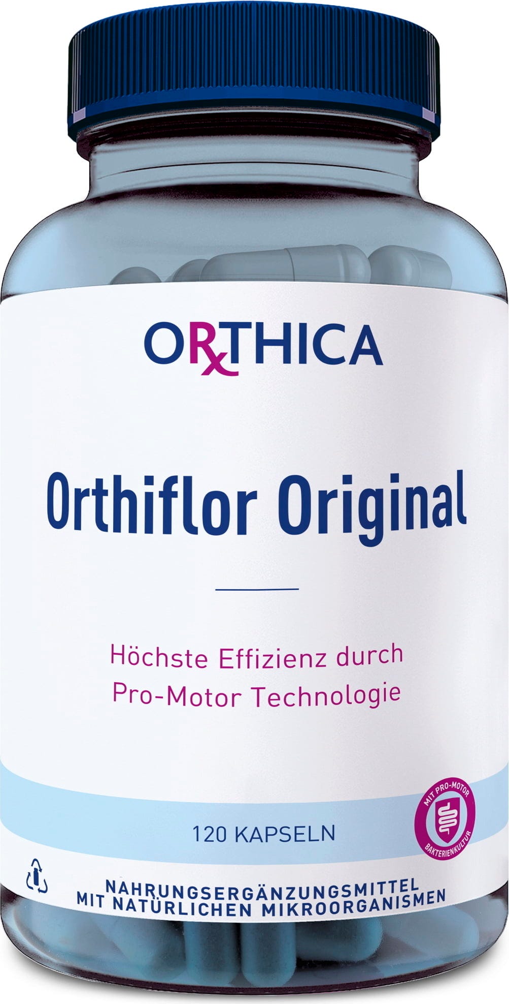 Orthiflor Original contains 7 types of lactic acid-producing bacteria. The capsules contain an ensemble of 9 different lactic acid-forming microorganisms, such as Bifidobacterium and Lactobacillus species, which are present in a defined quantity per capsule - represented as colony-forming units (CFU). The formulation also utilises so-called pro-motor technology, which enables flexible and uncomplicated ingestion without the need for refrigeration.