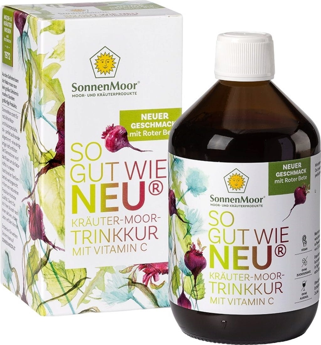 "As Good As New" with Beetroot concentrate is an intensive herbal extract from SonnenMoor, an Austrian family-run brand. The formulation combines the properties of 14 different botanicals, such as dandelion root, birch leaves, nettle, and artichoke, with the natural components of Trinkmoor. This liquid blend is enhanced with beetroot powder and acerola powder, which serves as a natural source of Vitamin C. Vitamin C contribute to protect cells from oxidative stress and a normal energy-yielding metabolism.